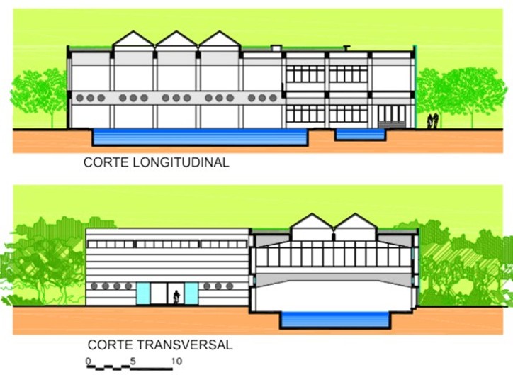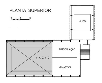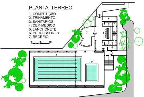 Projeto de edifício horizontal em dois pavimentos, com piscina olímpica no térreo